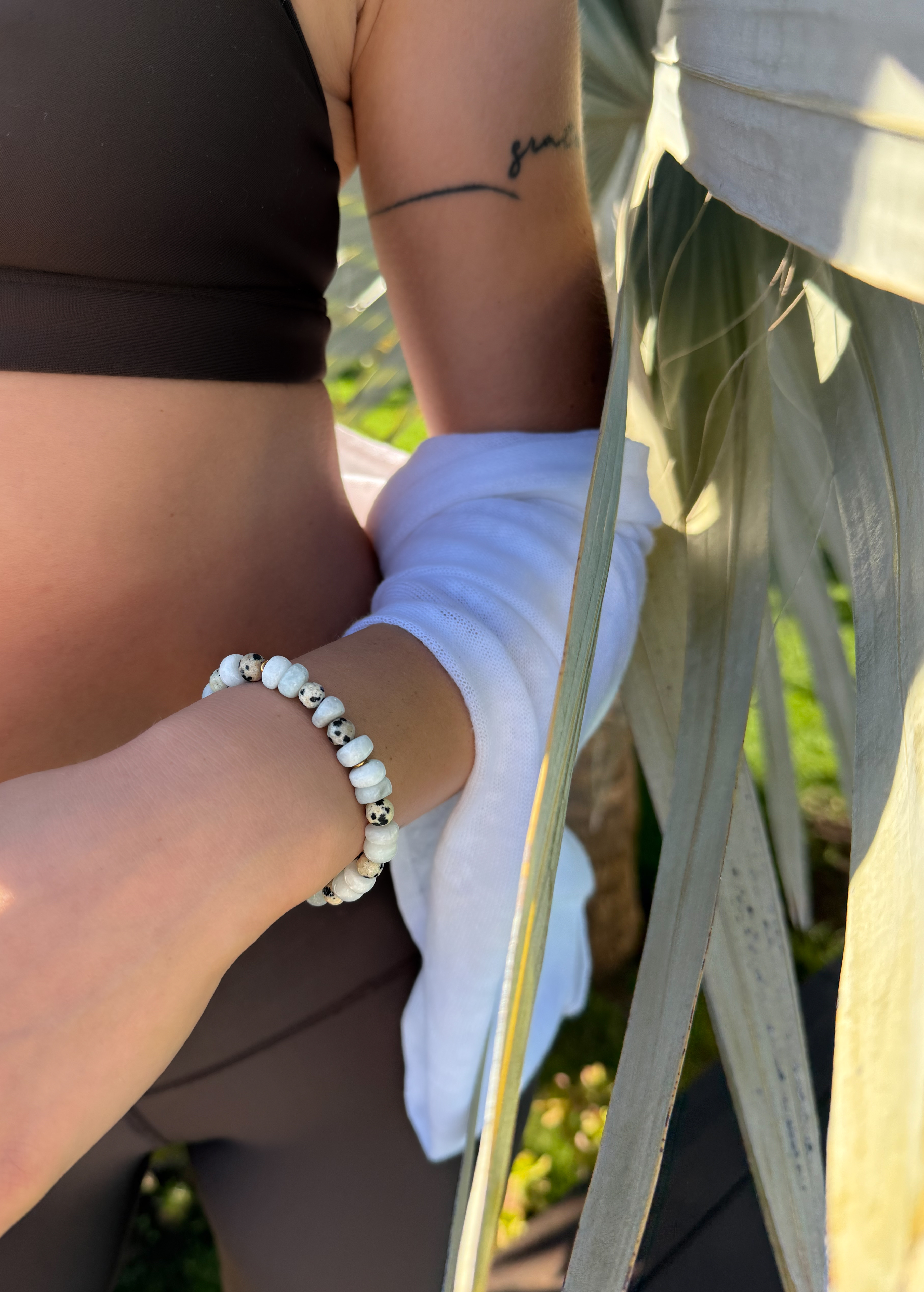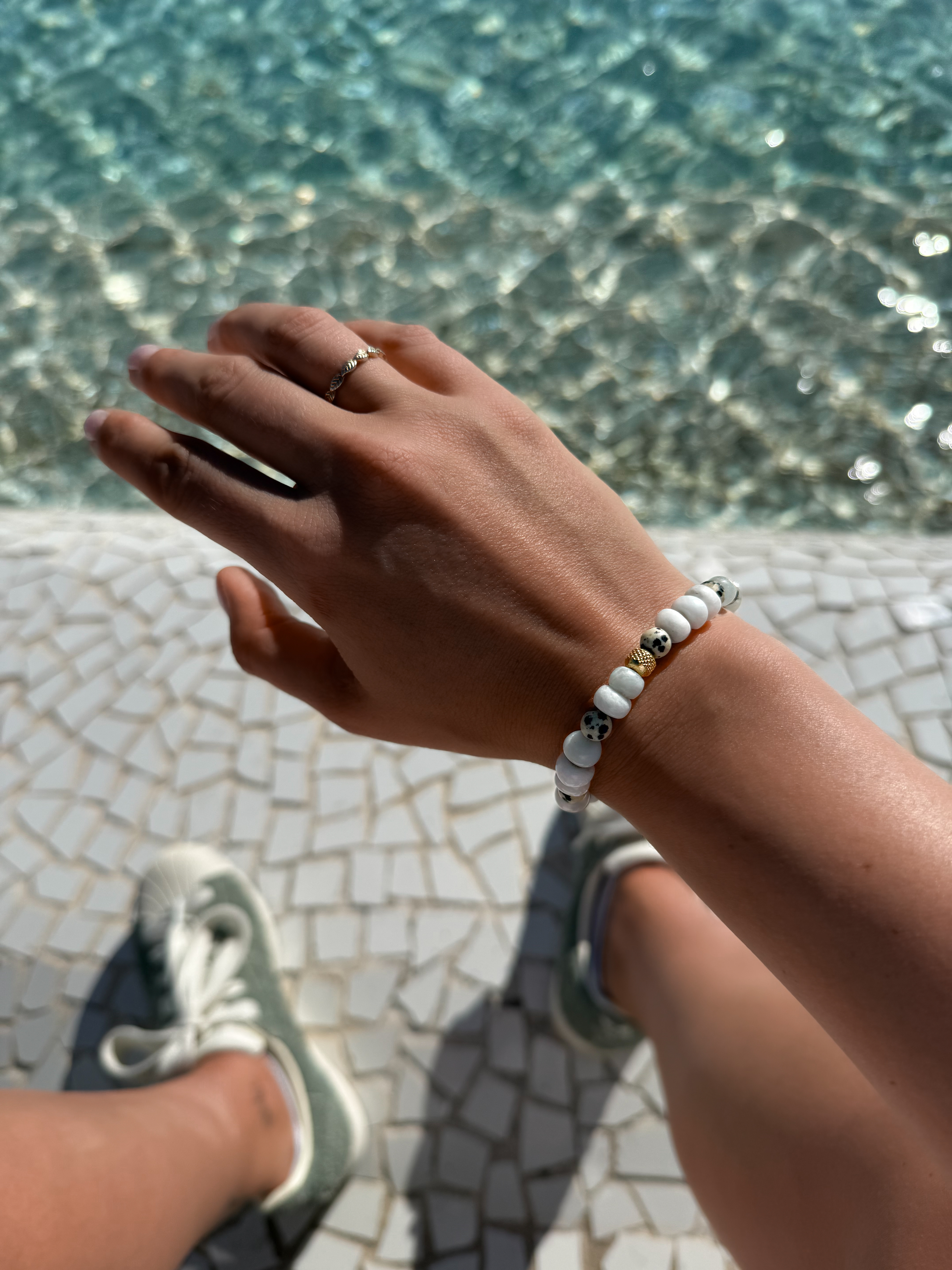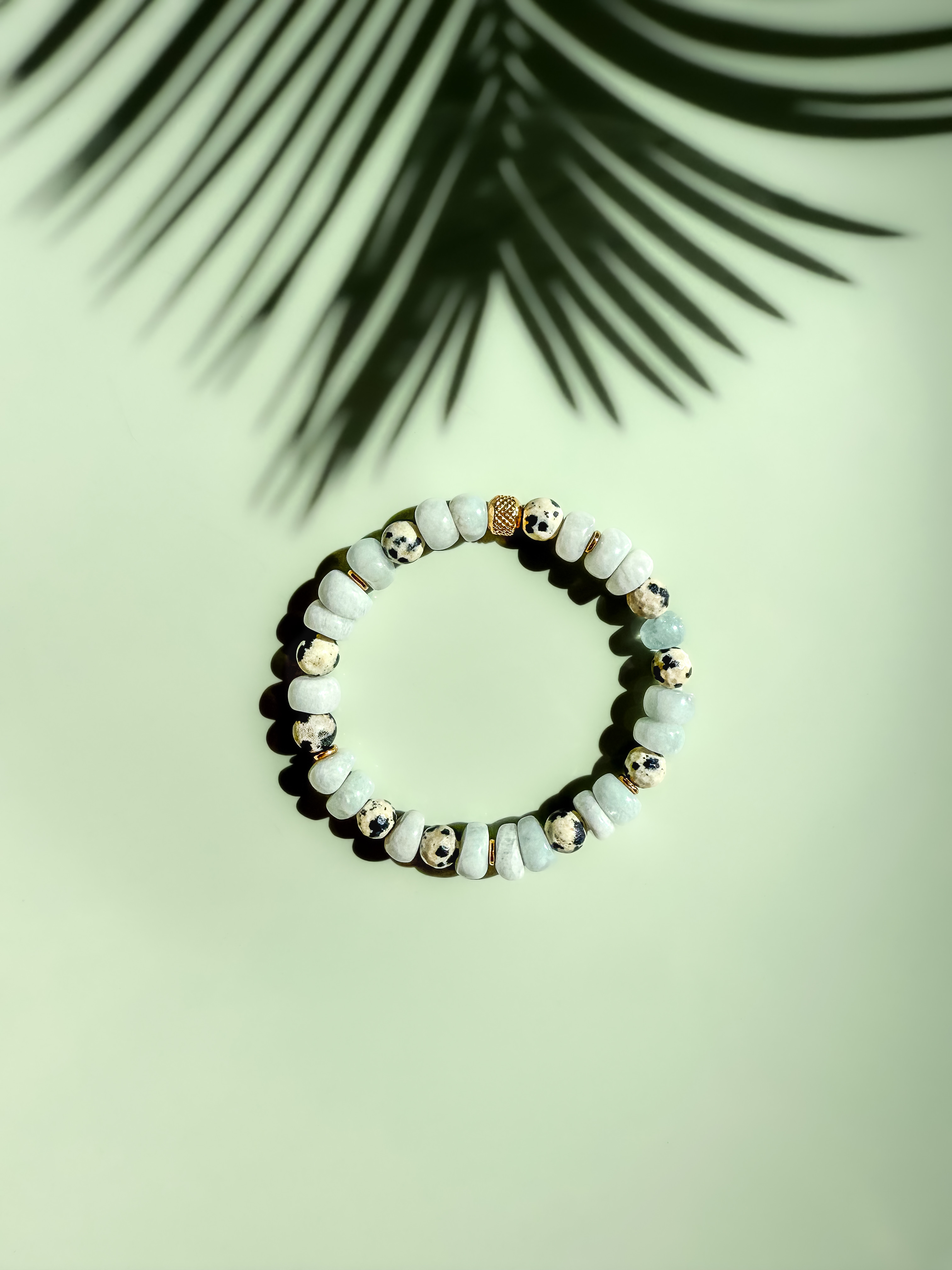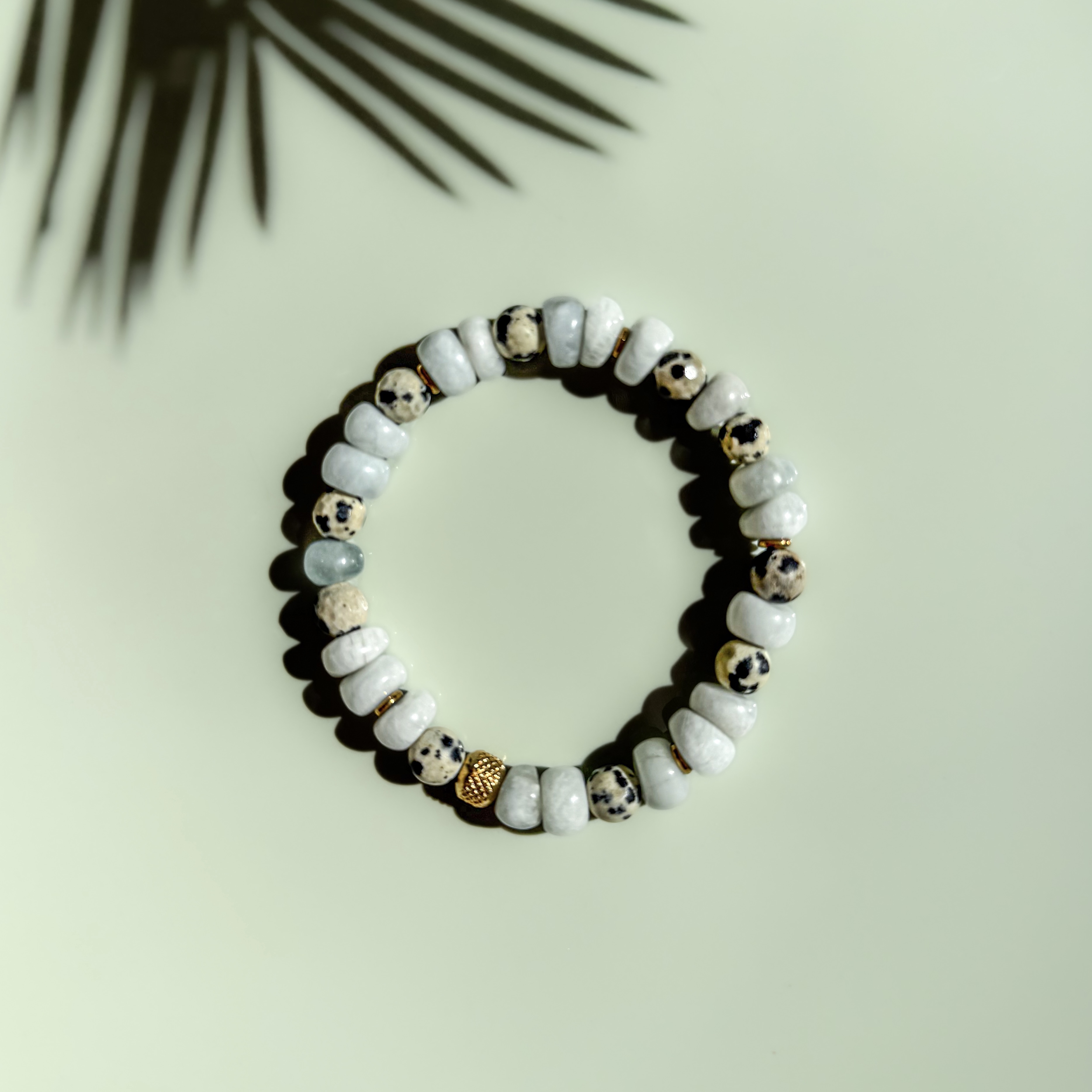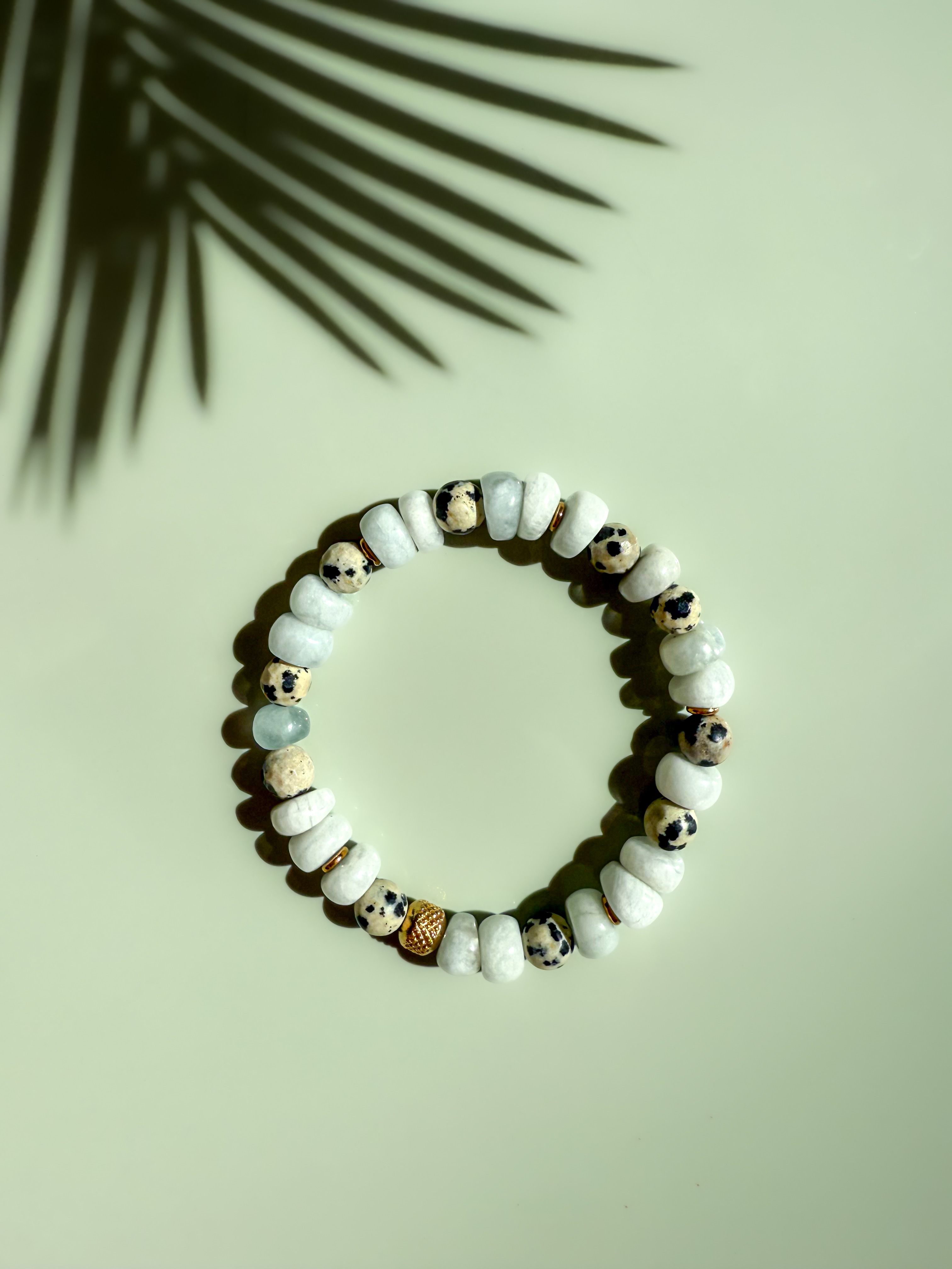 Azura to damska bransoletka wykonana z naturalnego akwamarynu i jaspisu dalmatyńskiego, których jasne, subtelne odcienie przywodzą na myśl spokojne kolory wody i piasku. Kamienie zostały zestawione z elementami z hematytu złoconego oraz koralikiem ze stali chirurgicznej złoconej, które dodają całości elegancji i delikatnego blasku.