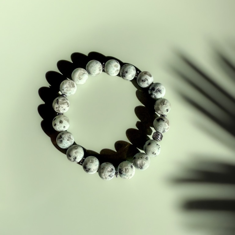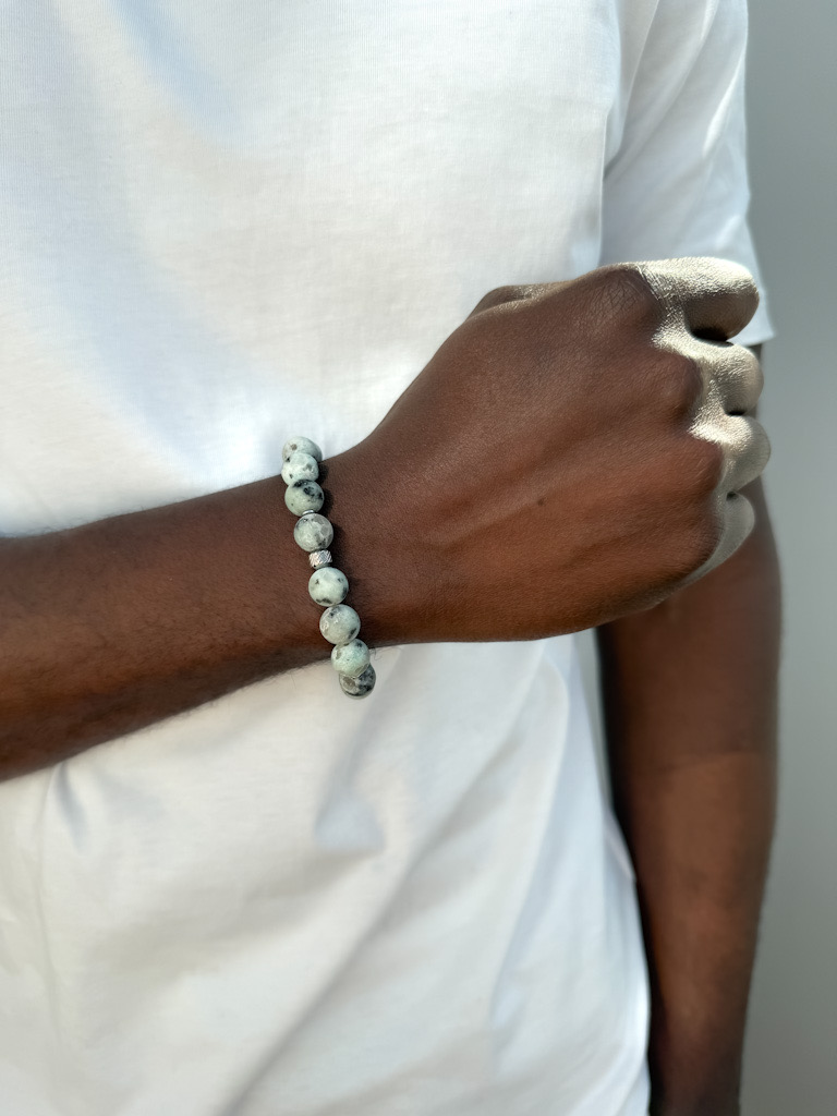 Thalor to męska bransoletka wykonana z naturalnego jaspisu kiwi, kamienia o jasnej, kremowo-zielonej barwie z charakterystycznymi, ciemnymi inkluzjami. Każdy kamień posiada unikalny wzór, dzięki czemu każda bransoletka jest niepowtarzalna.