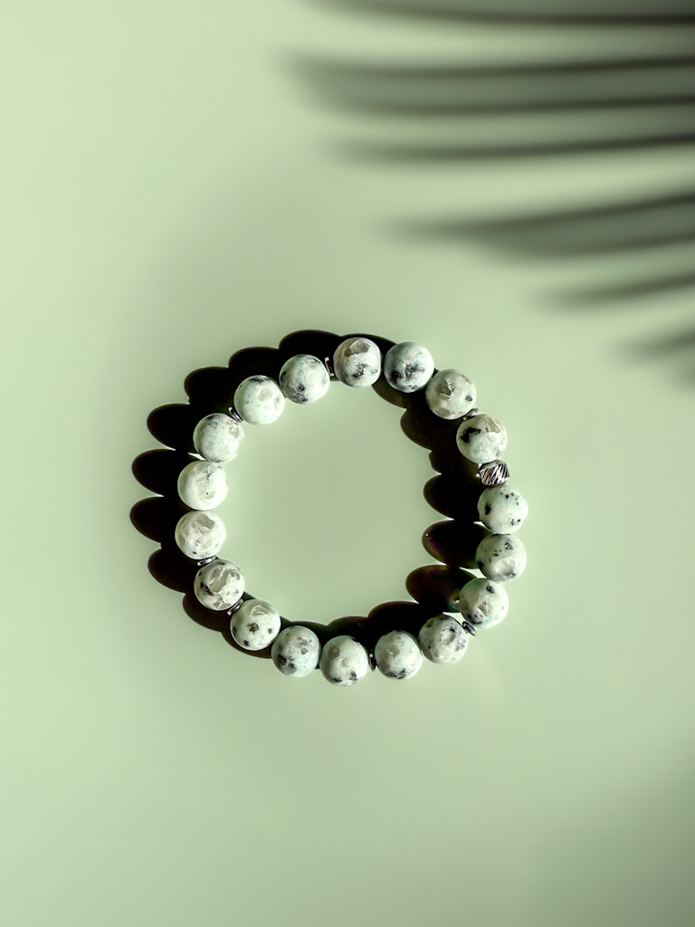 Naturalna kolorystyka jaspisu kiwi nadaje bransoletce spokojny, ziemisty charakter, który dobrze komponuje się z codziennym stylem. Kamienie zostały zestawione z subtelnymi metalowymi detalami, które podkreślają strukturę minerału i dodają całości wyrazistości.