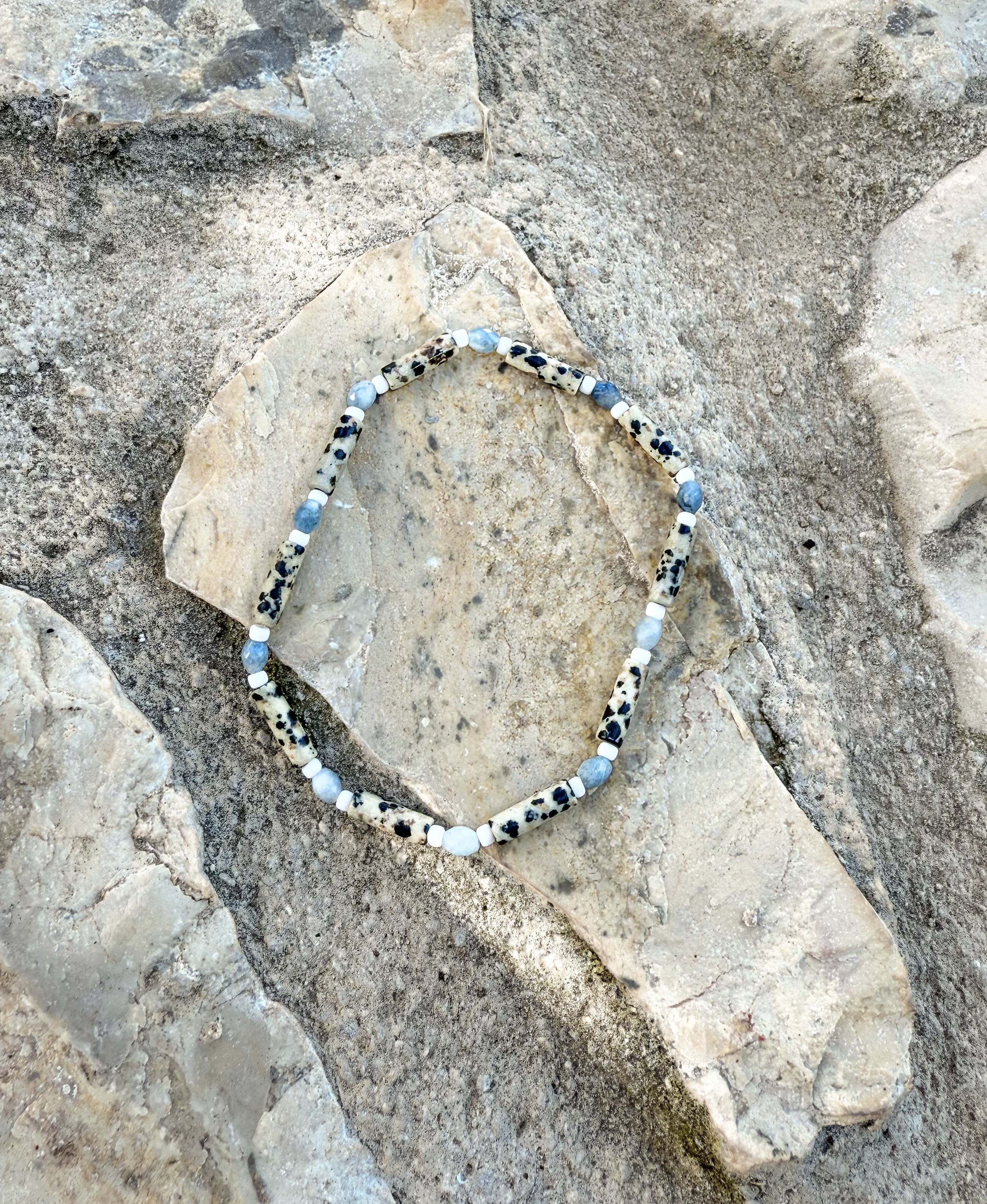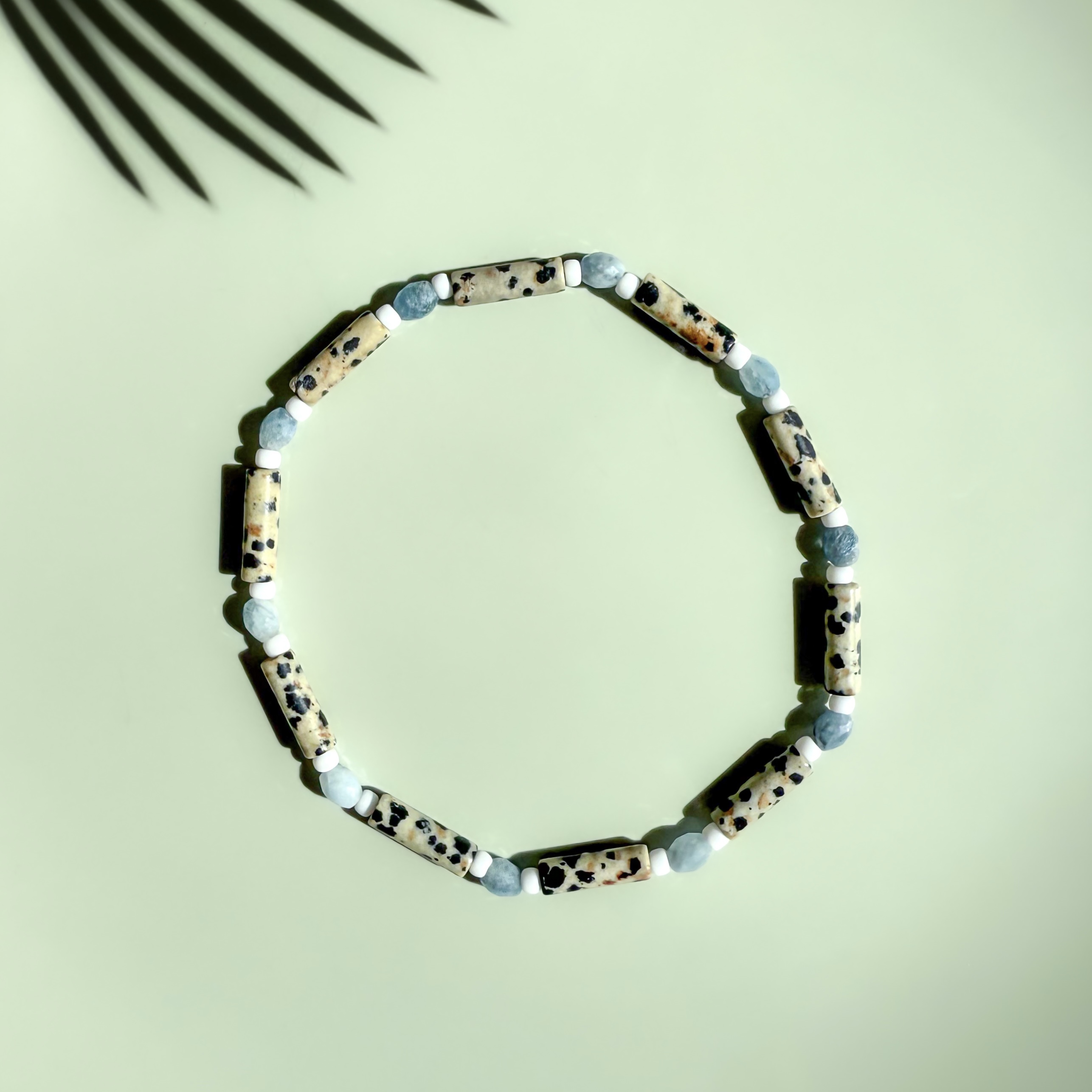 Vela to delikatna bransoletka na kostkę wykonana z naturalnego jaspisu dalmatyńskiego oraz akwamarynu, uzupełniona drobnymi szklanymi koralikami Toho, które nadają jej lekkości i subtelnego wykończenia.