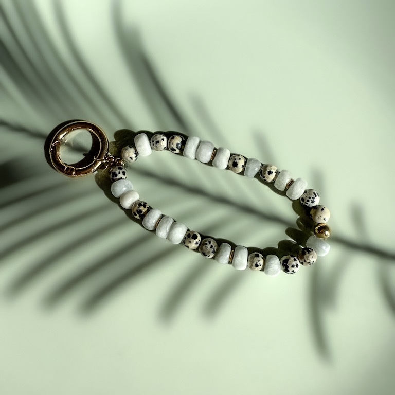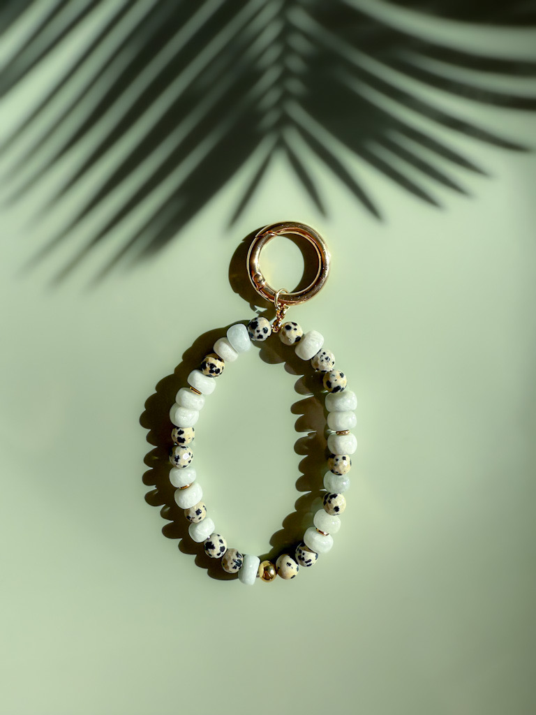 Naturalny, lekko surowy i pełen charakteru. Lora to uniwersalny brelok wykonany z naturalnego amazonitu oraz jaspisu dalmatyńskiego. Subtelna mięta amazonitu łączy się z charakterystycznym, nakrapianym wzorem jaspisu, tworząc harmonijną i wyjątkową kompozycję inspirowaną naturą.