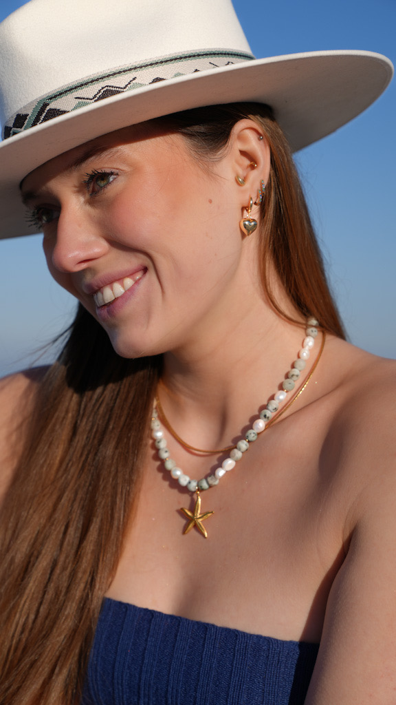 Jaspis kiwi wnosi do projektu równowagę i subtelną strukturę kamienia, a naturalne perły dodają mu światła i miękkiej elegancji. Całość dopełnia zawieszka w kształcie rozgwiazdy ze złoconej stali delikatny akcent inspirowany oceanem i letnią wolnością.