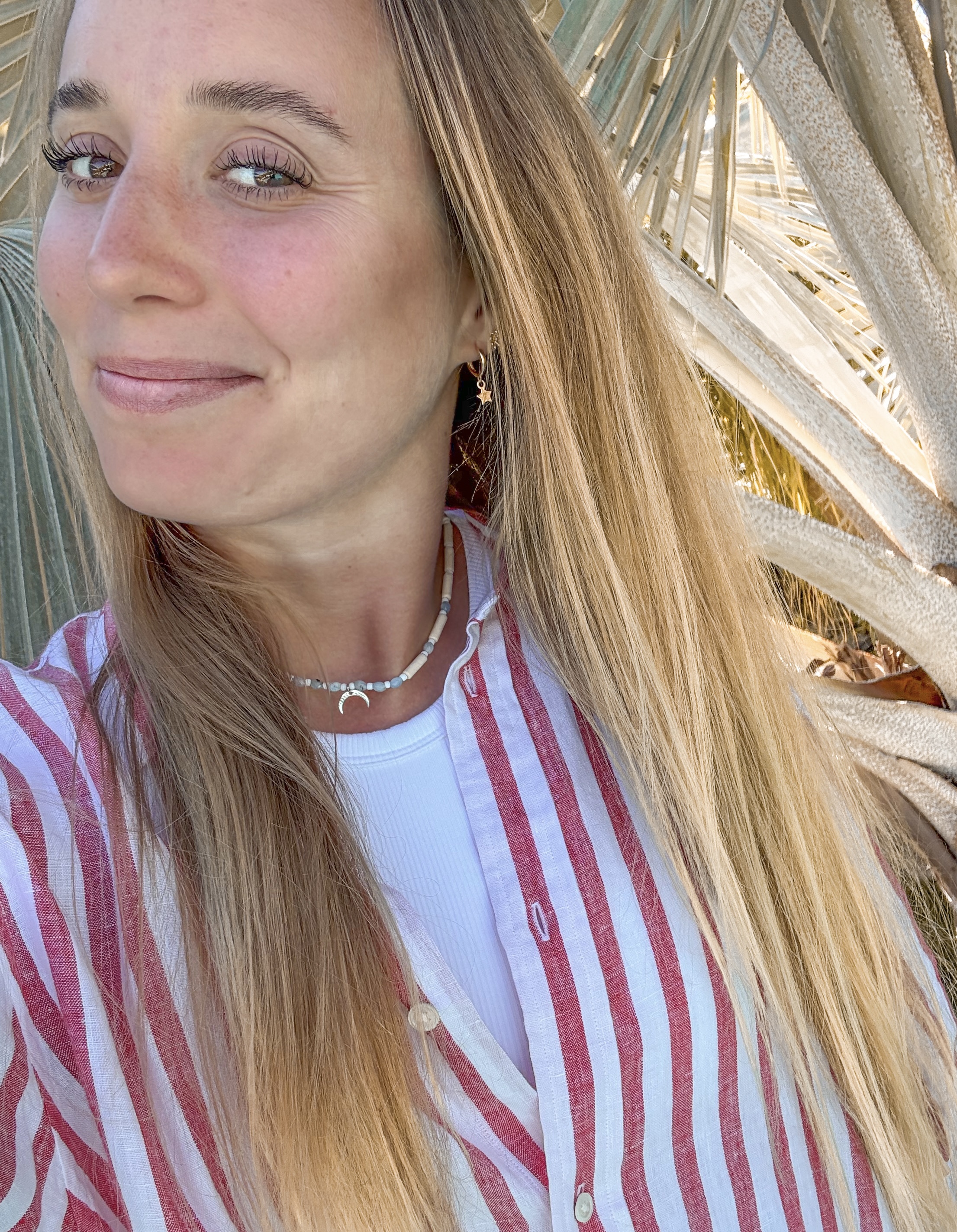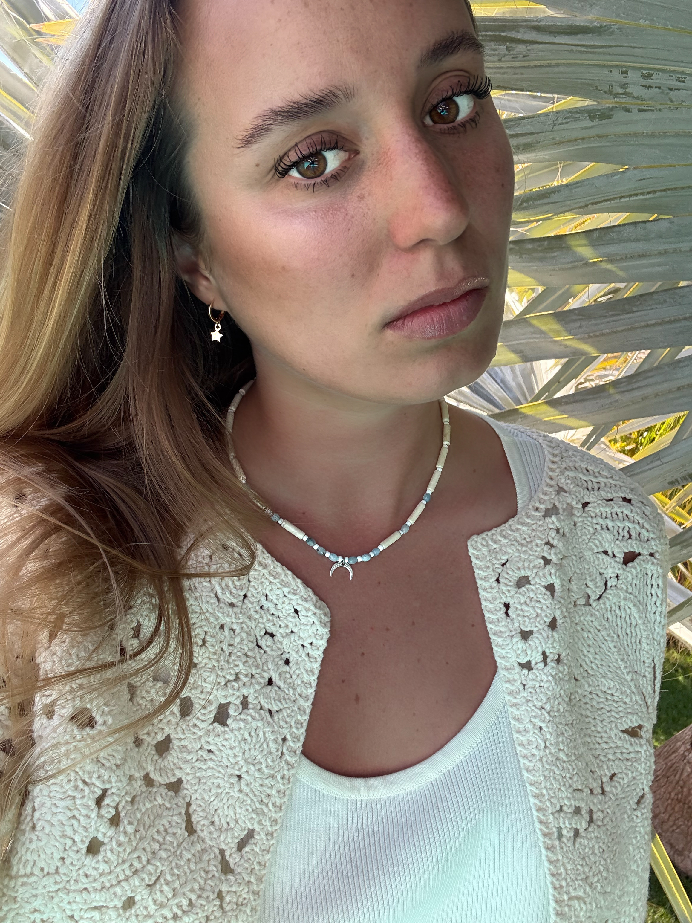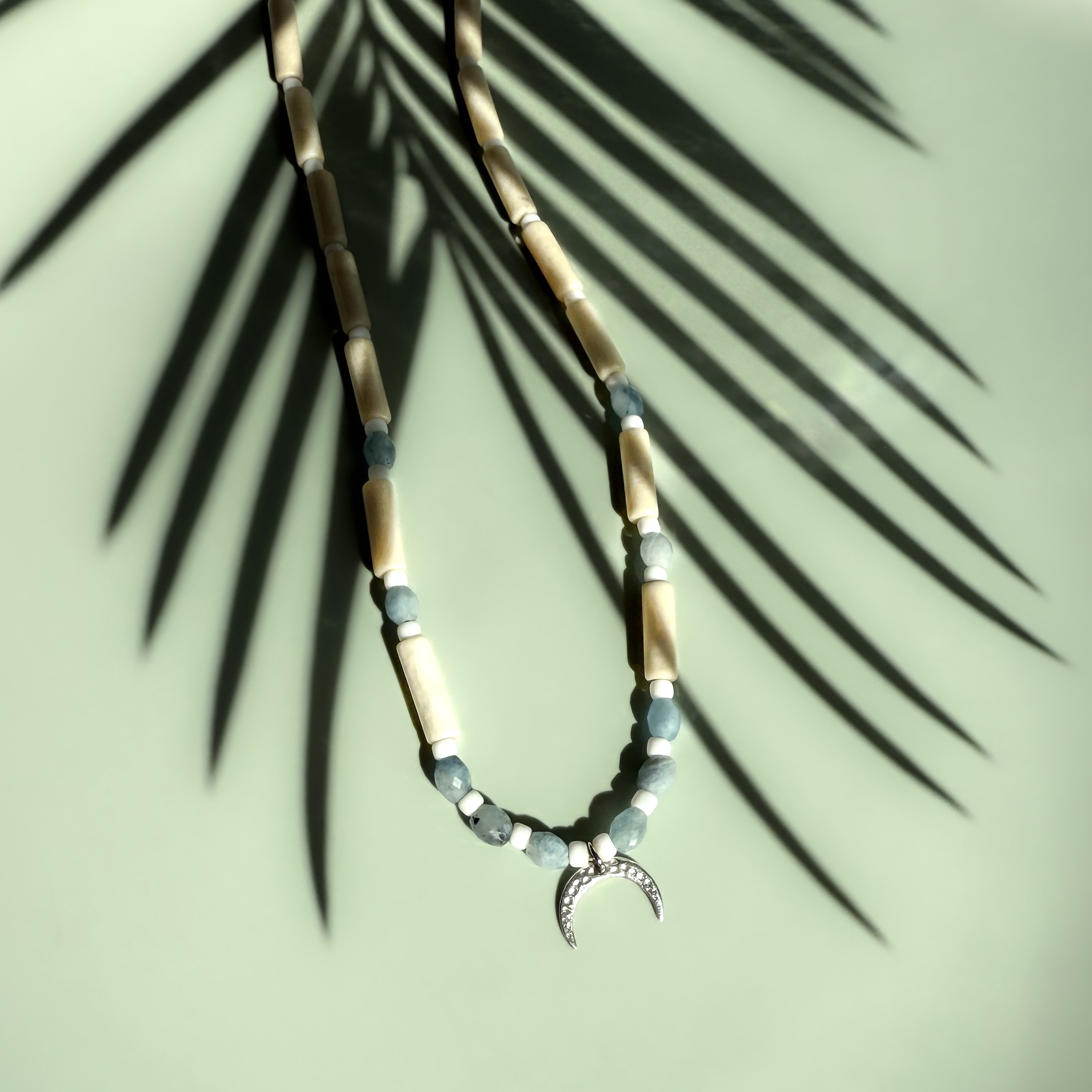 Maris to naszyjnik wykonany z naturalnego akwamarynu w chłodnych, jasnych odcieniach oraz kamienia rzecznego, który nadaje kompozycji organicznej struktury i subtelnej różnorodności. Całość została uzupełniona drobnymi koralikami Toho oraz zawieszką ze srebra w kształcie półksiężyca, stanowiącą delikatny, przyciągający uwagę akcent.