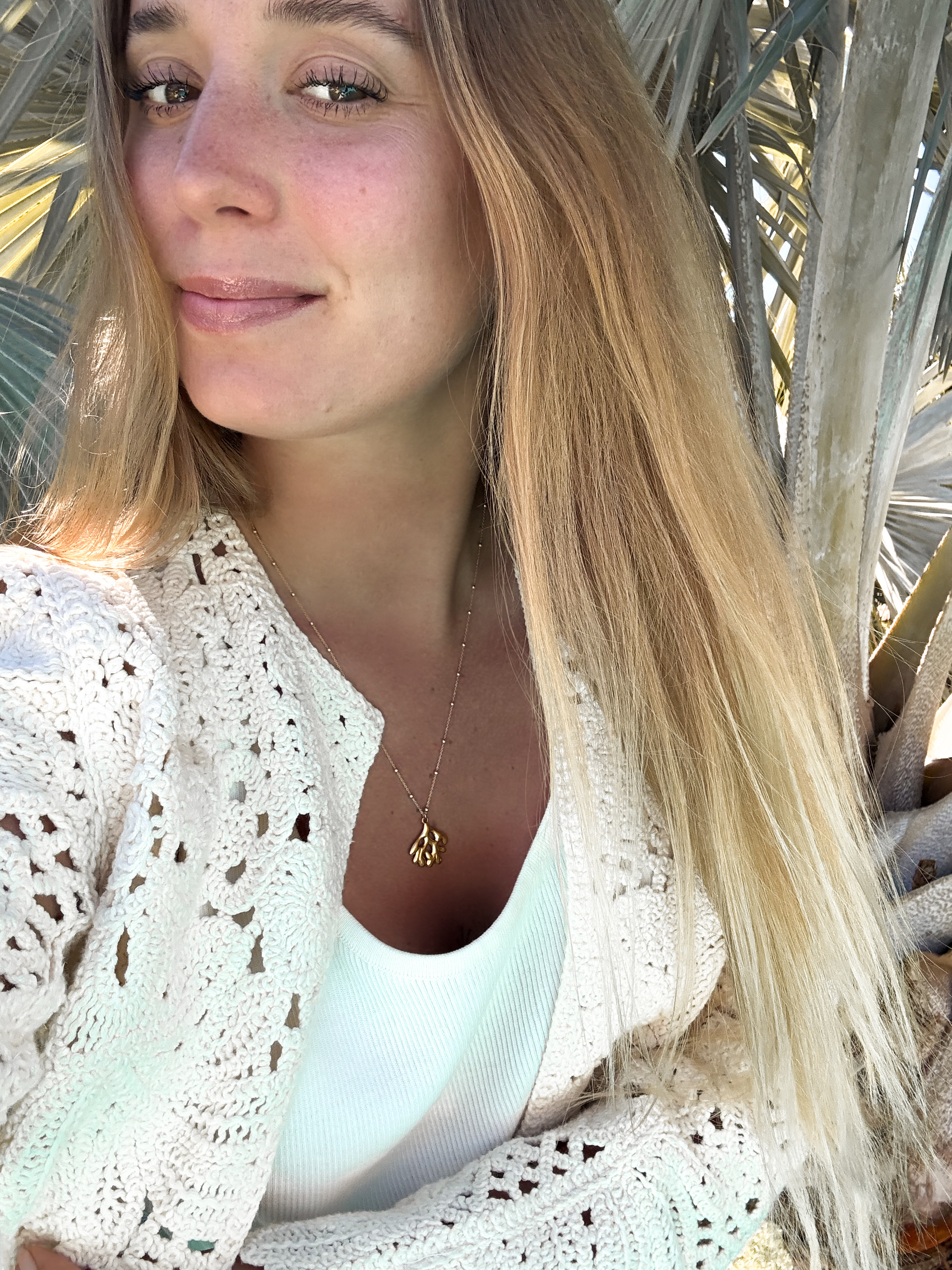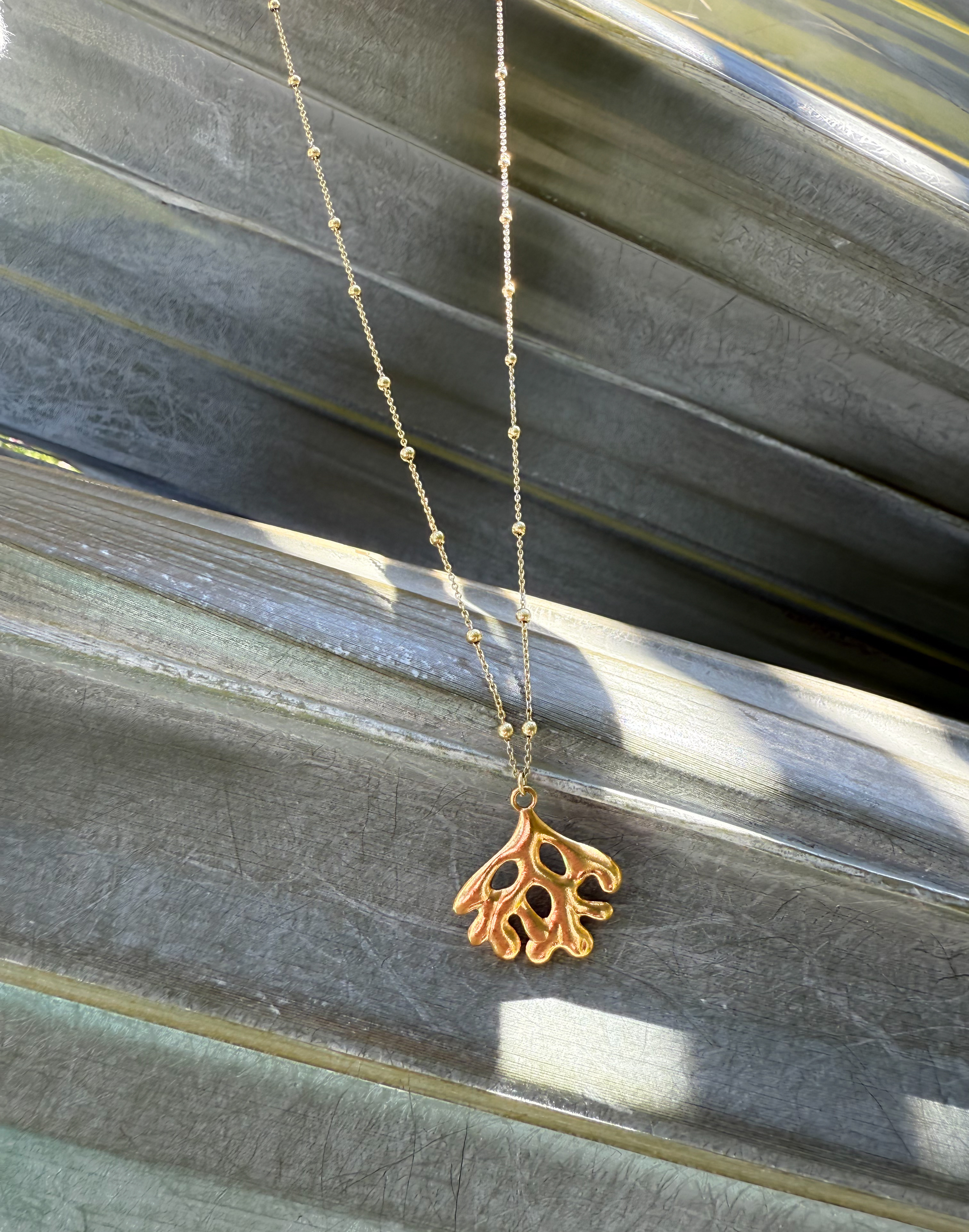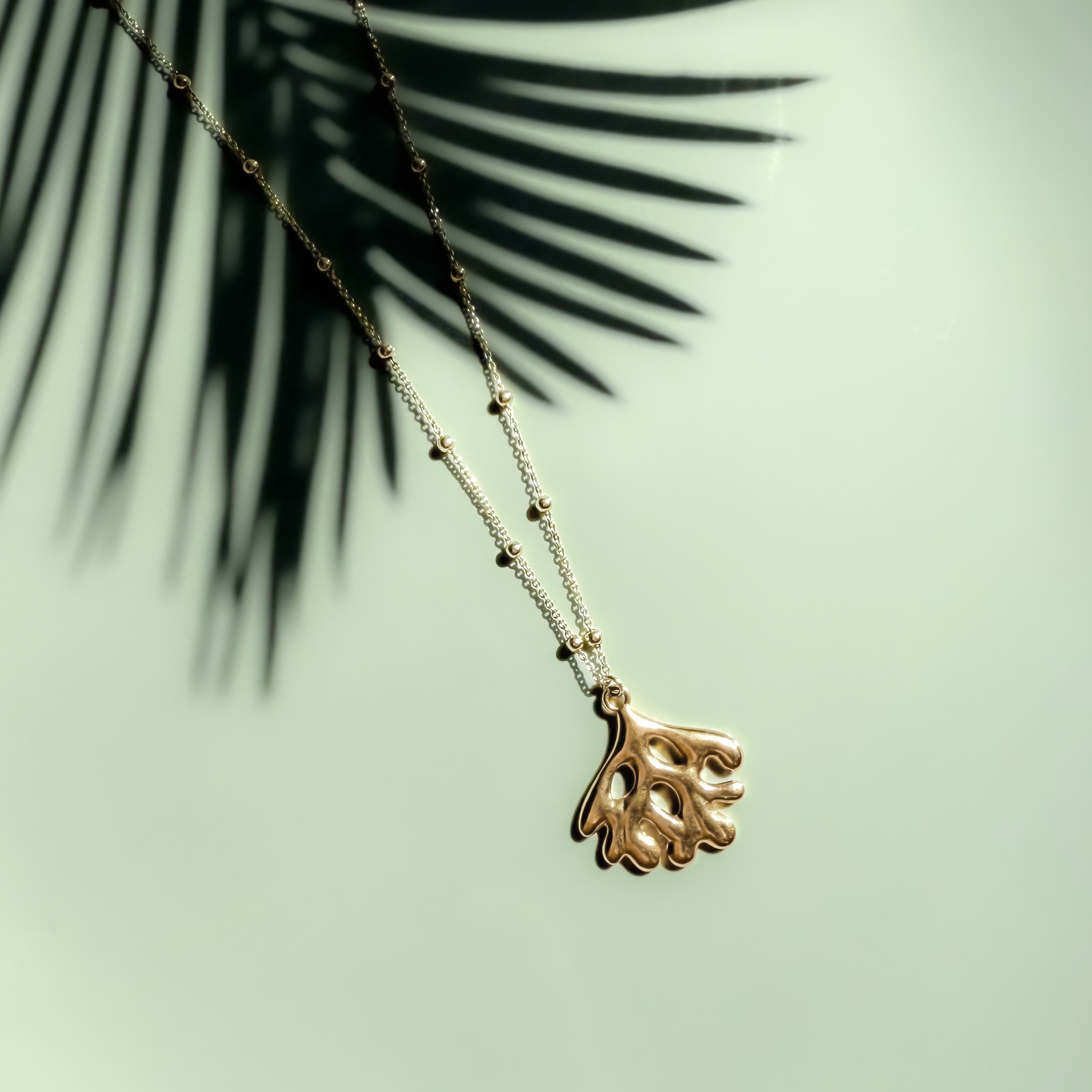 Riva to delikatny naszyjnik wykonany z łańcuszka ze srebra próby 925 złoconego, uzupełniony organiczną zawieszką ze stali chirurgicznej złoconej. Jego subtelna forma i nieregularny kształt zawieszki tworzą harmonijną kompozycję inspirowaną naturą.