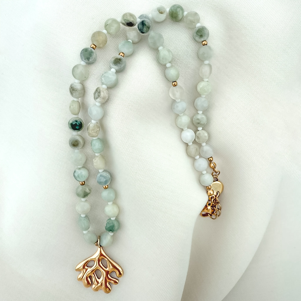Całość uzupełnia zawieszka w kształcie koralowca oraz zapięcie wykonane ze stali szlachetnej pokrytej złotem, nadające naszyjnikowi elegancki, ale naturalny charakter. Regulowane zapięcie pozwala łatwo dopasować długość do stylizacji.