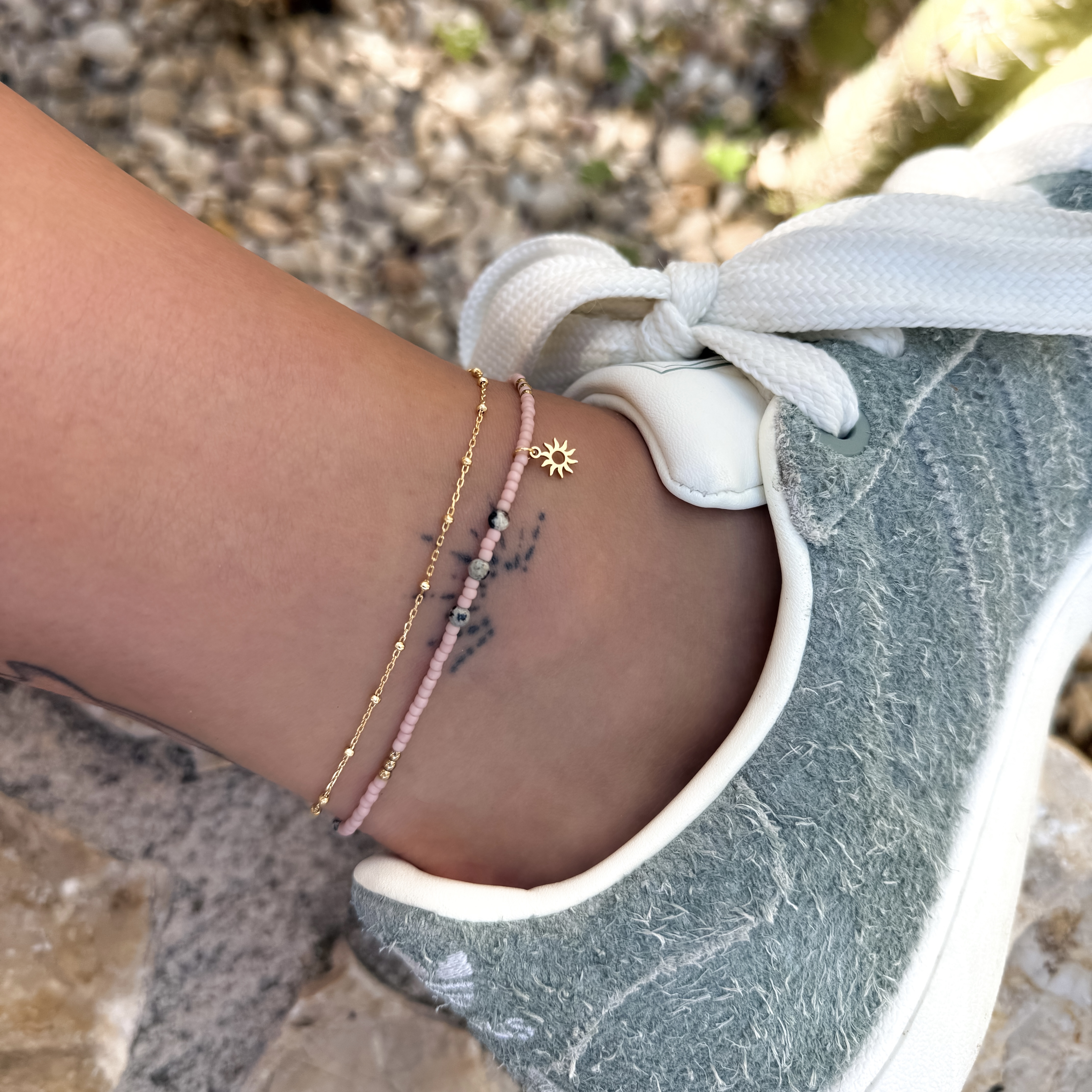 Goldi & Cala to subtelny zestaw dwóch bransoletek na kostkę, który łączy delikatny blask złota z lekką, letnią kolorystyką koralików. To harmonijna kompozycja stworzona z myślą o wakacyjnych stylizacjach i swobodnym, naturalnym stylu.