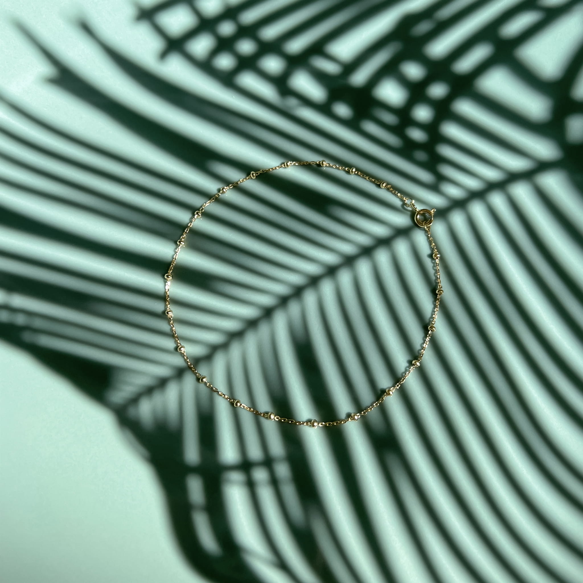 Bransoletka Goldi została wykonana ze srebra próby 925 złoconego 14k złotem. Jej minimalistyczna forma i drobne kuleczki pięknie odbijają światło, dodając kostce subtelnej elegancji.