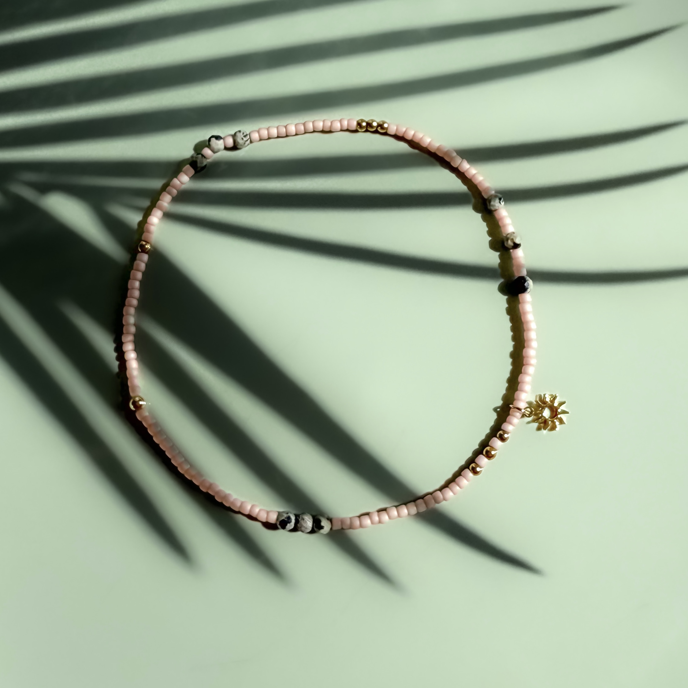 Bransoletka Cala to delikatne połączenie drobnych szklanych koralików Toho i naturalnego jaspisu dalmatyńskiego, uzupełnione zawieszką ze złoconej stali chirurgicznej. Jasna, pudrowa kolorystyka przełamana kontrastowymi akcentami kamieni tworzy świeżą, letnią kompozycję, a złocona zawieszka dodaje całości subtelnego blasku.