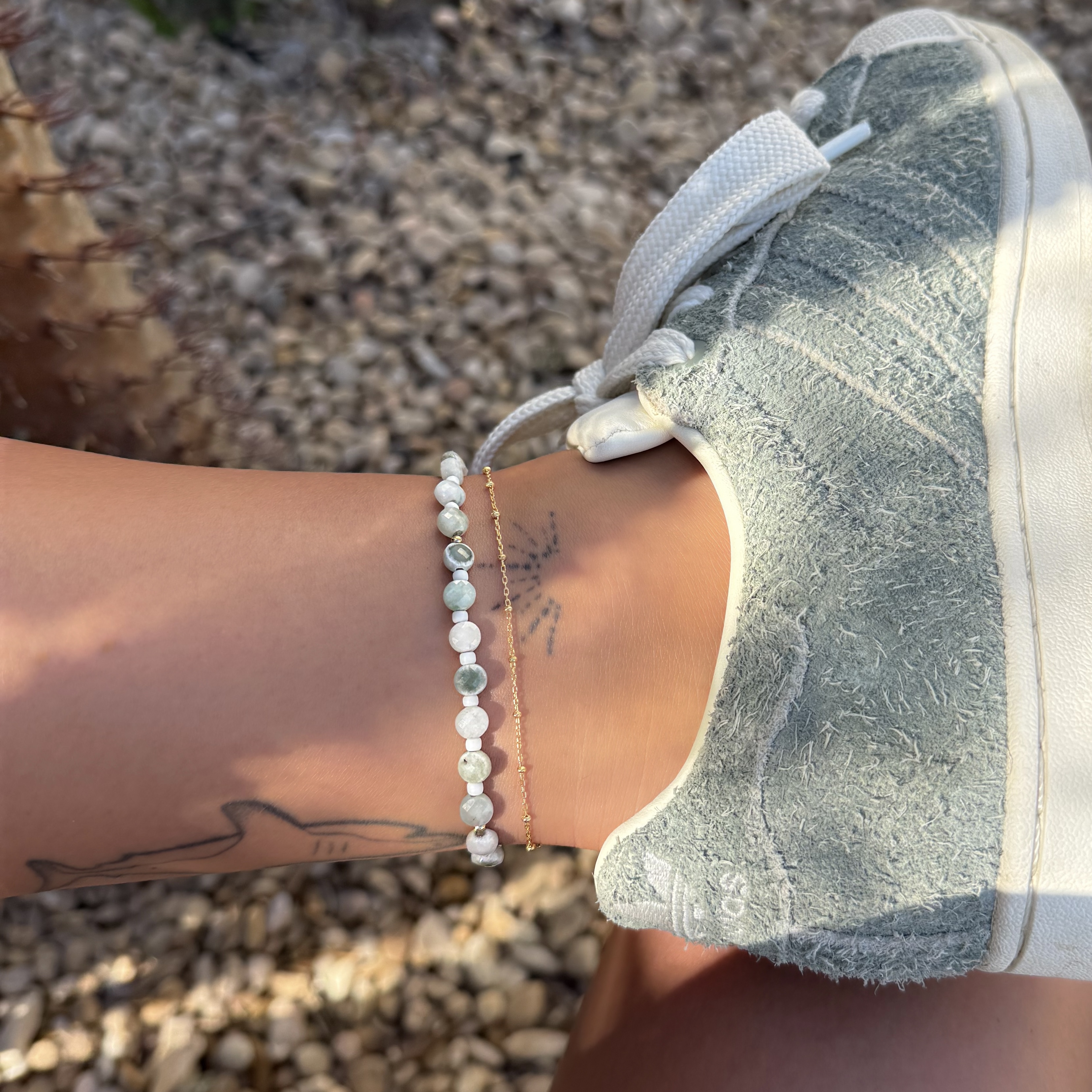Goldi & Niva to subtelny zestaw dwóch bransoletek na kostkę, który łączy delikatny blask złota z naturalnym pięknem kamieni. To harmonijna kompozycja stworzona z myślą o letnich stylizacjach i lekkim, niewymuszonym stylu.