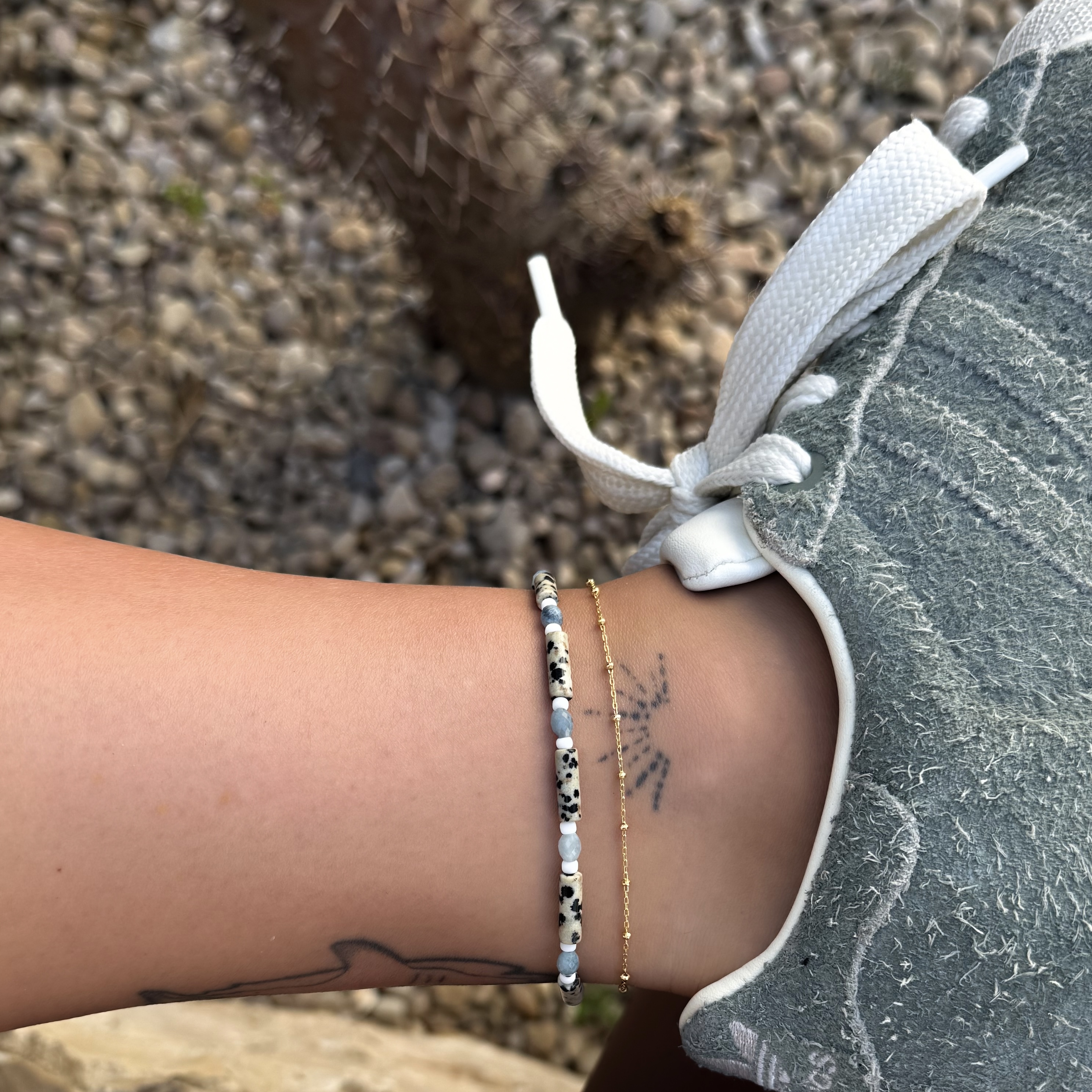 Goldi & Vela to subtelny zestaw dwóch bransoletek na kostkę, który łączy minimalistyczny blask złota z naturalnym charakterem kamieni. To harmonijna kompozycja stworzona z myślą o letnich stylizacjach i lekkim, swobodnym stylu.